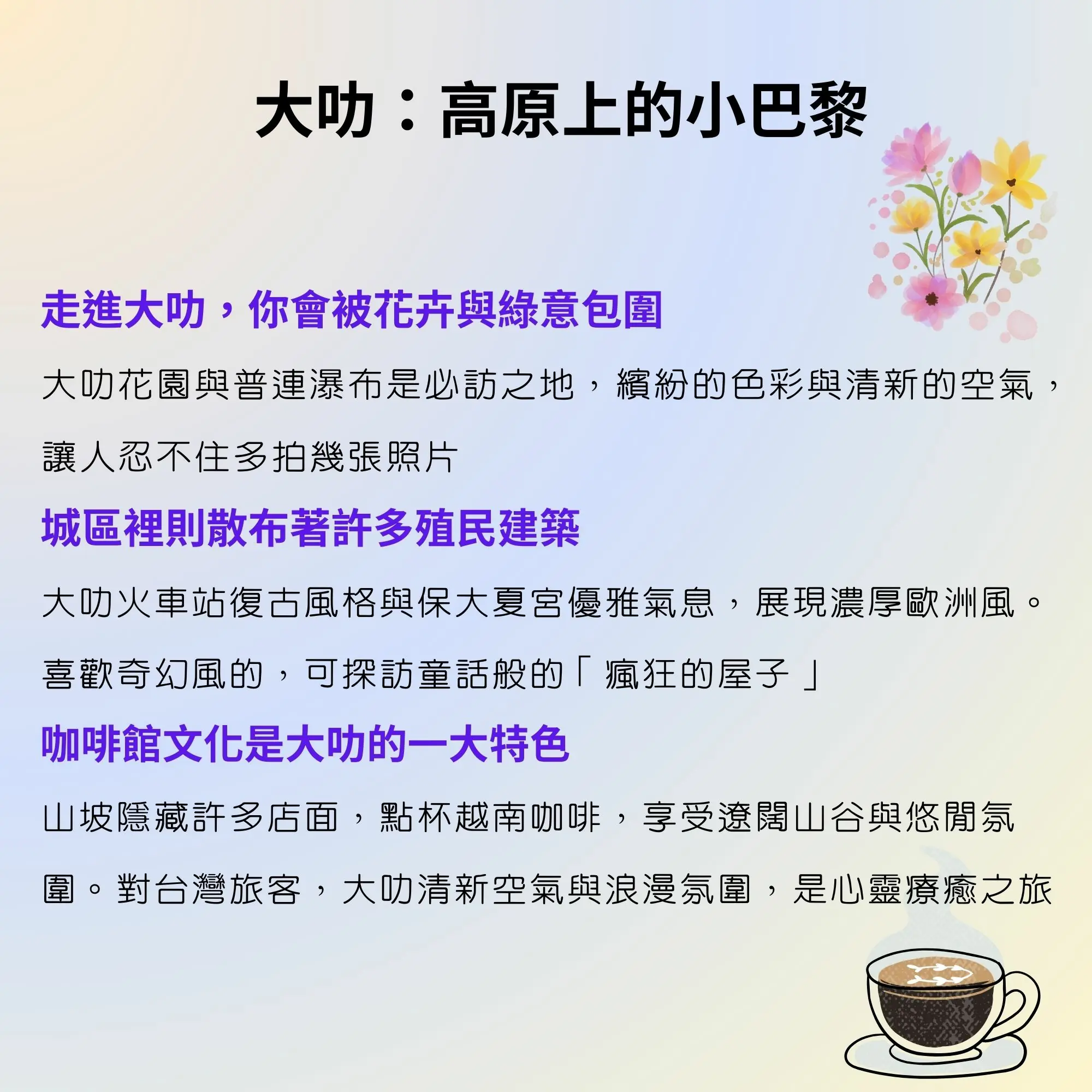 大叻位於越南中南部高原,因氣候涼爽與法式氛圍,被譽為「小巴黎」。這裡四季如春,是當地人最愛的避暑勝地,如今也逐漸吸引國際旅人。