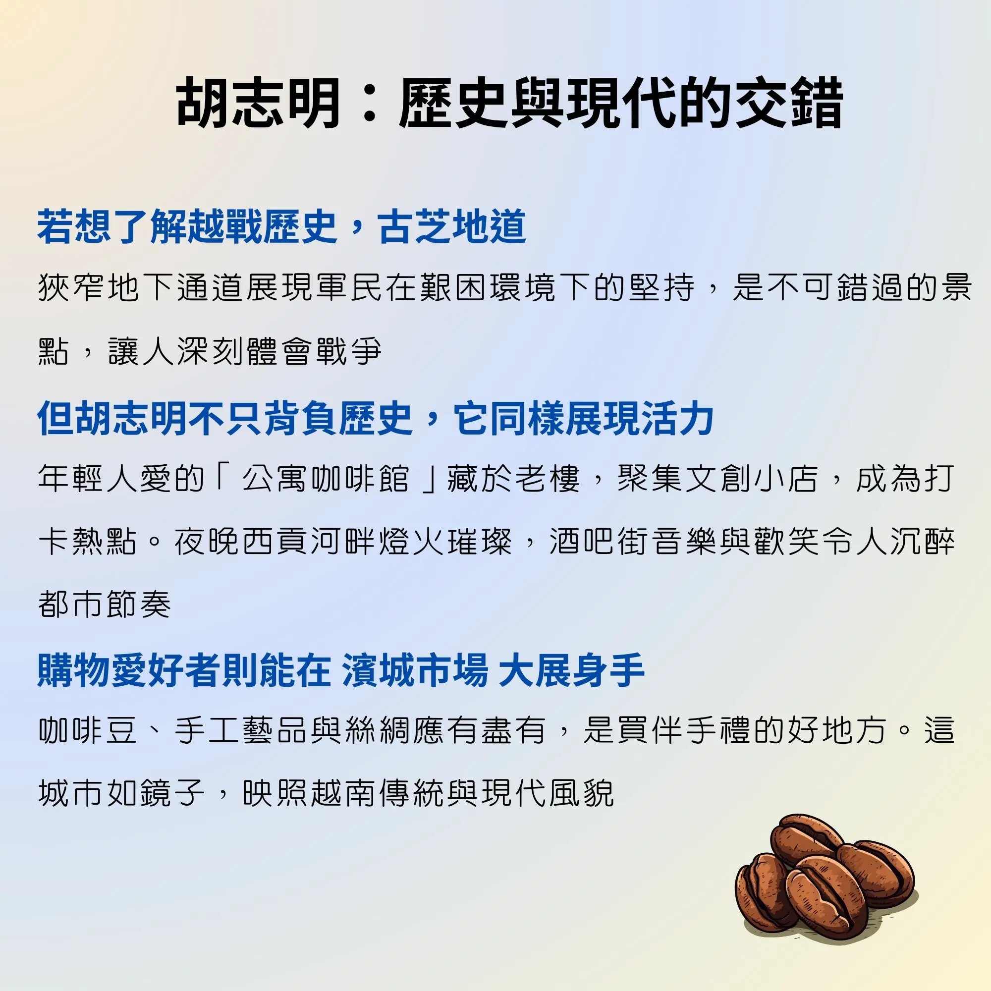 從咖啡豆、手工藝品到絲綢,應有盡有,是選購伴手禮的最佳地點。這座城市,就像一面鏡子,反射著越南傳統與現代的雙重面貌。