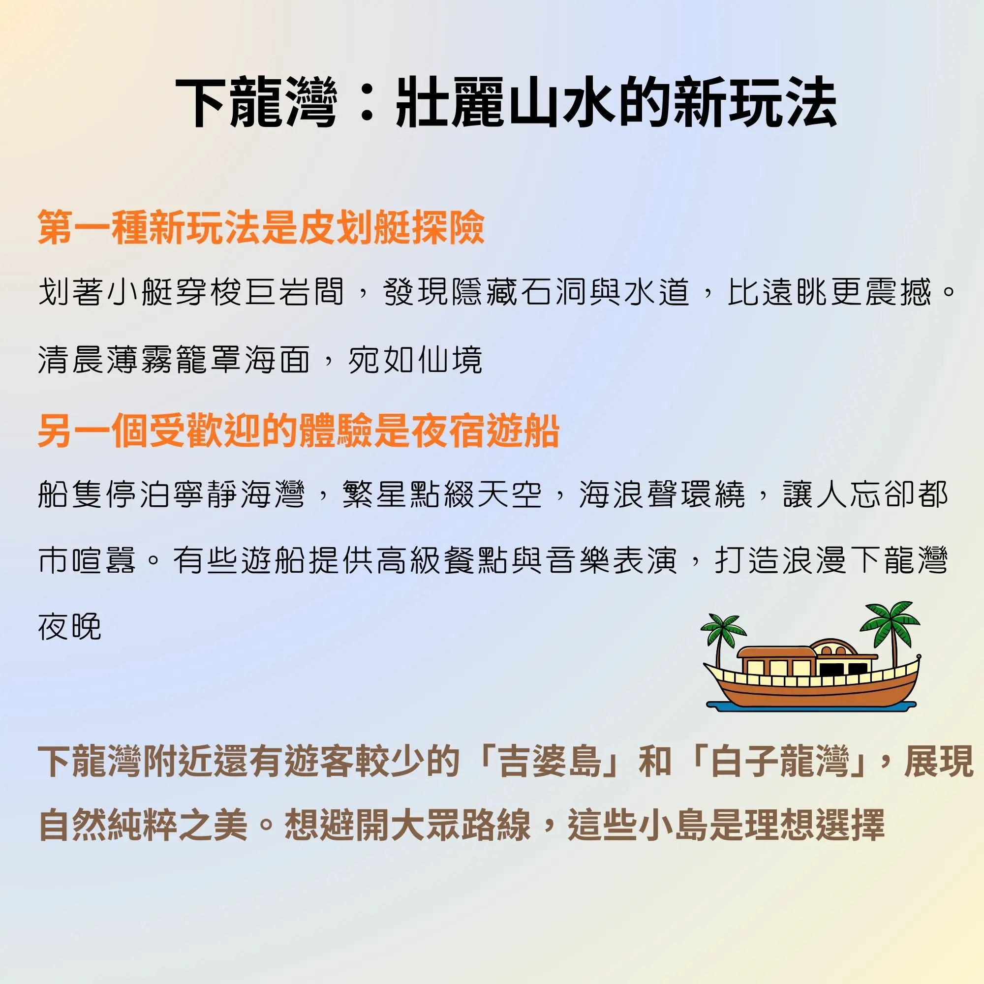 除了海上活動,下龍灣周邊還有「吉婆島」與「白子龍灣」等隱藏景點。這些地方遊客較少,更能展現自然純粹之美。如果你想找尋不同於大眾行程的路線,這些小島是理想的選擇。