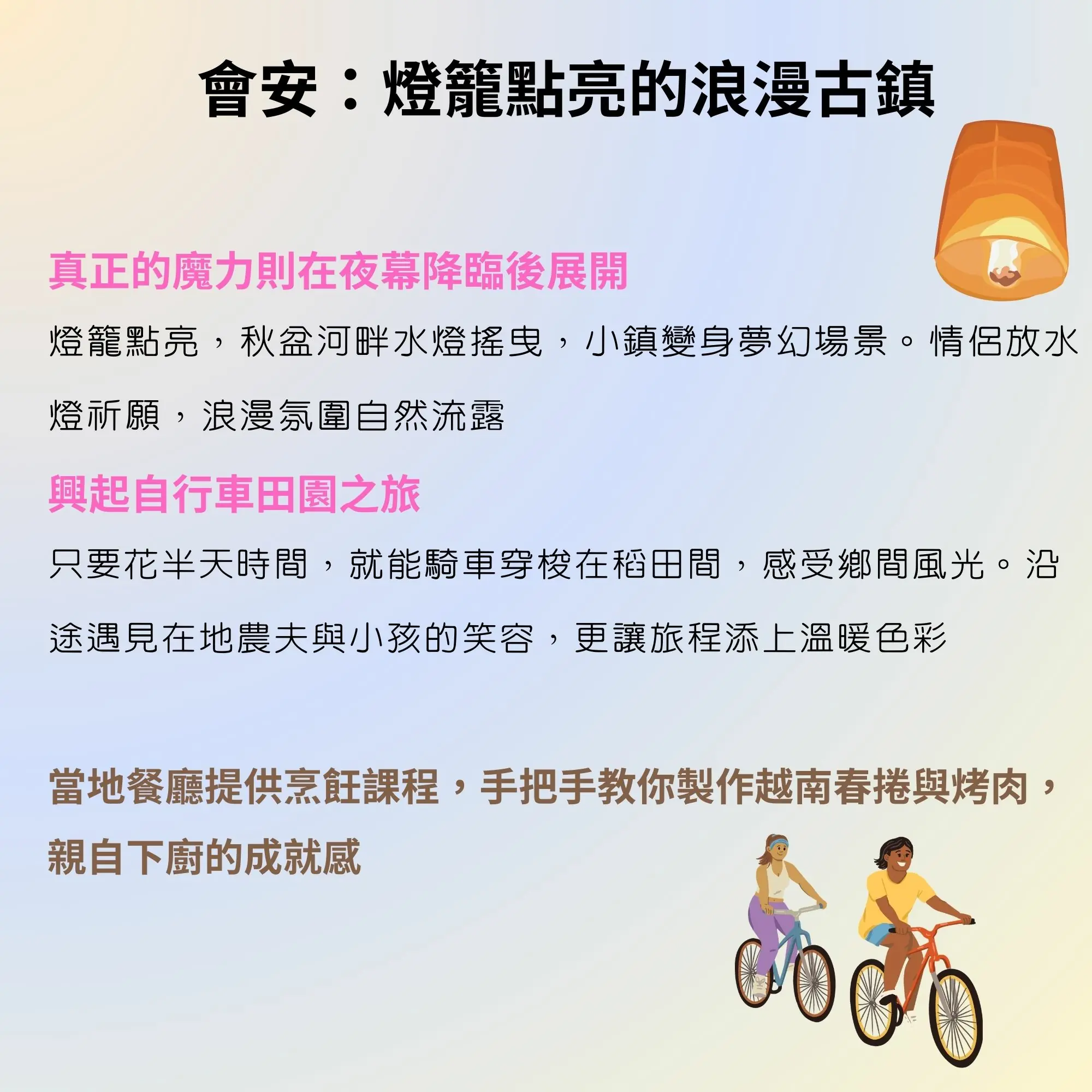 越南的美,不只是景點上的「打卡」而已,而是一種能讓人身心沉浸的體驗。你可能在黃昏時坐在遊船甲板上,看著落日染紅下龍灣海面;也可能在古鎮巷弄中,與燈籠一同映照夜色;又或許在高原大叻,啜飲一杯咖啡,眼前就是山谷與花園的遼闊。