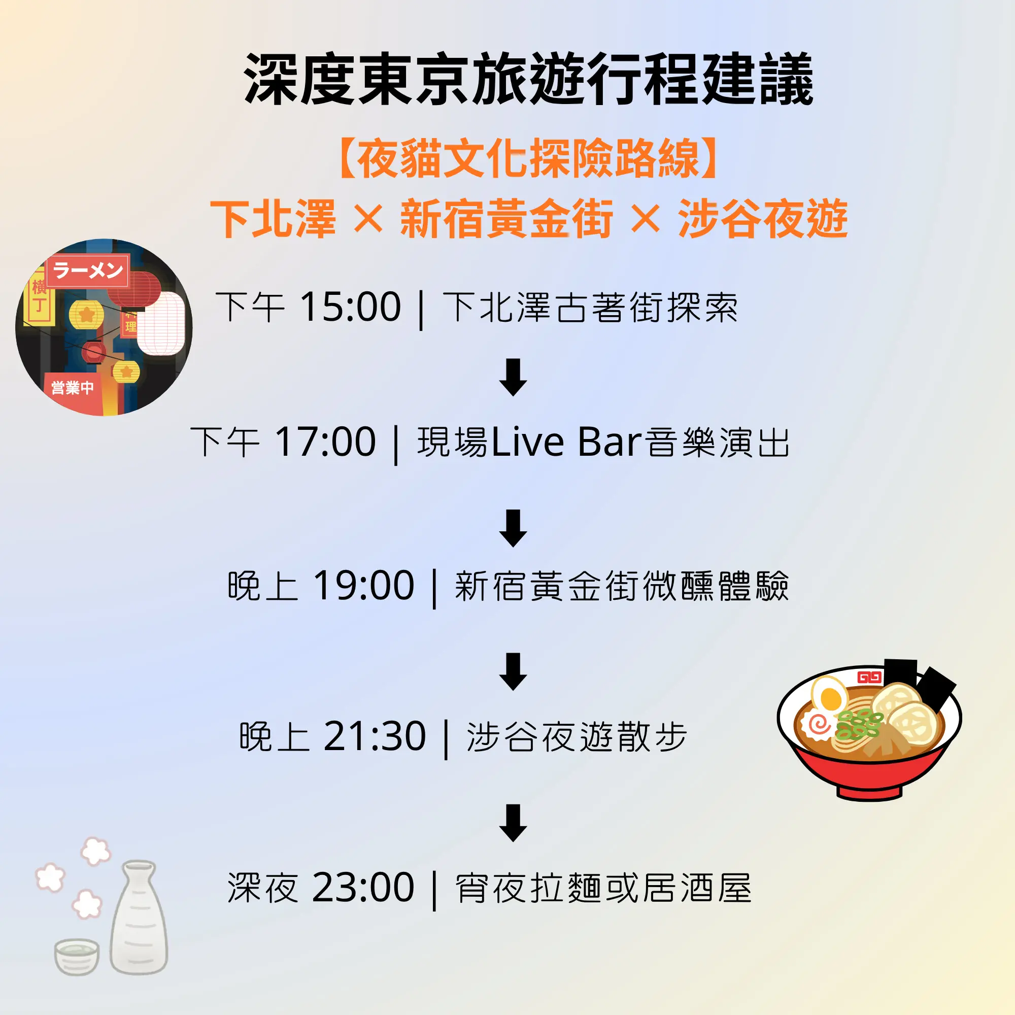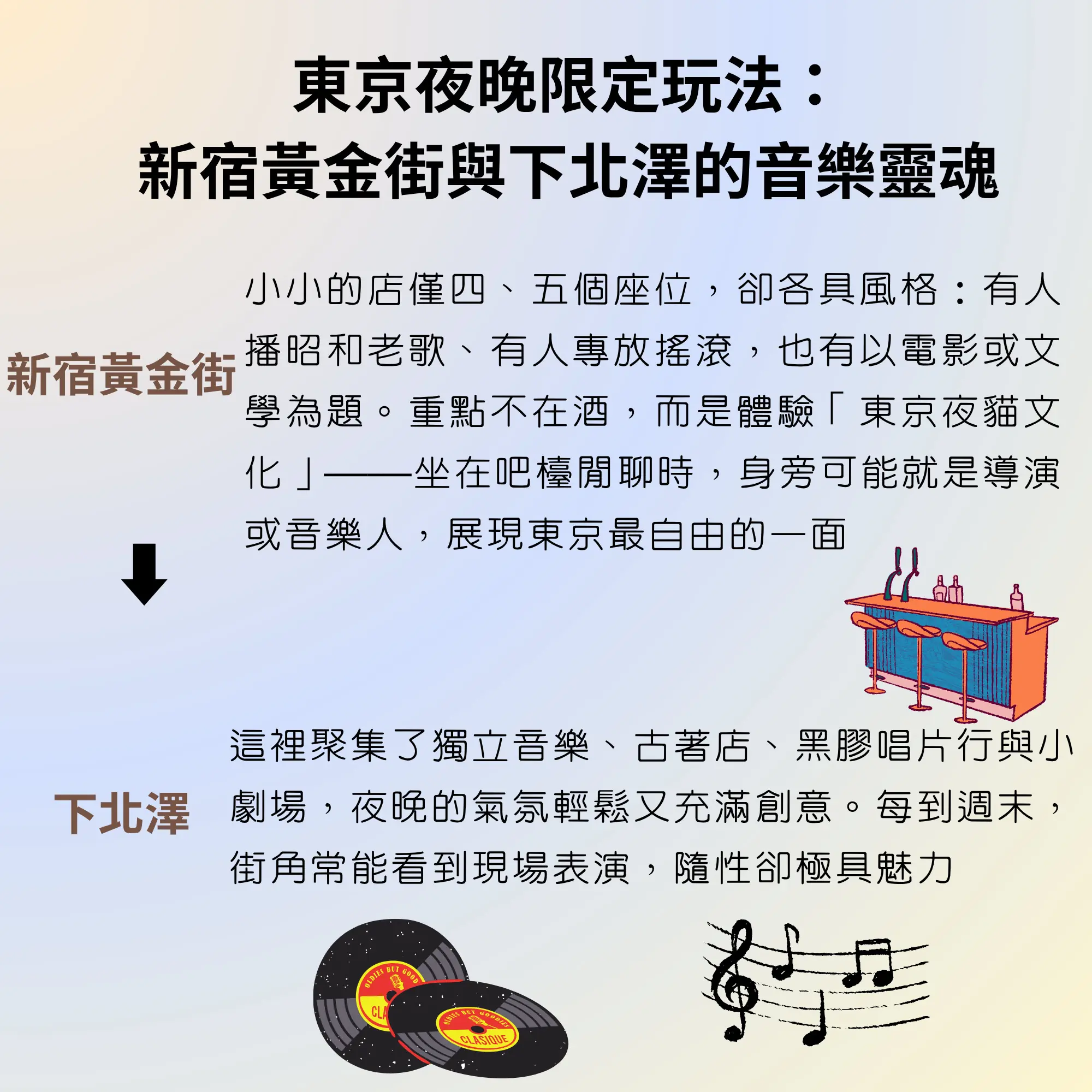 如果你是夜行性旅人、愛音樂、愛探索在地夜生活,這條路線就是專屬於你的東京節奏。