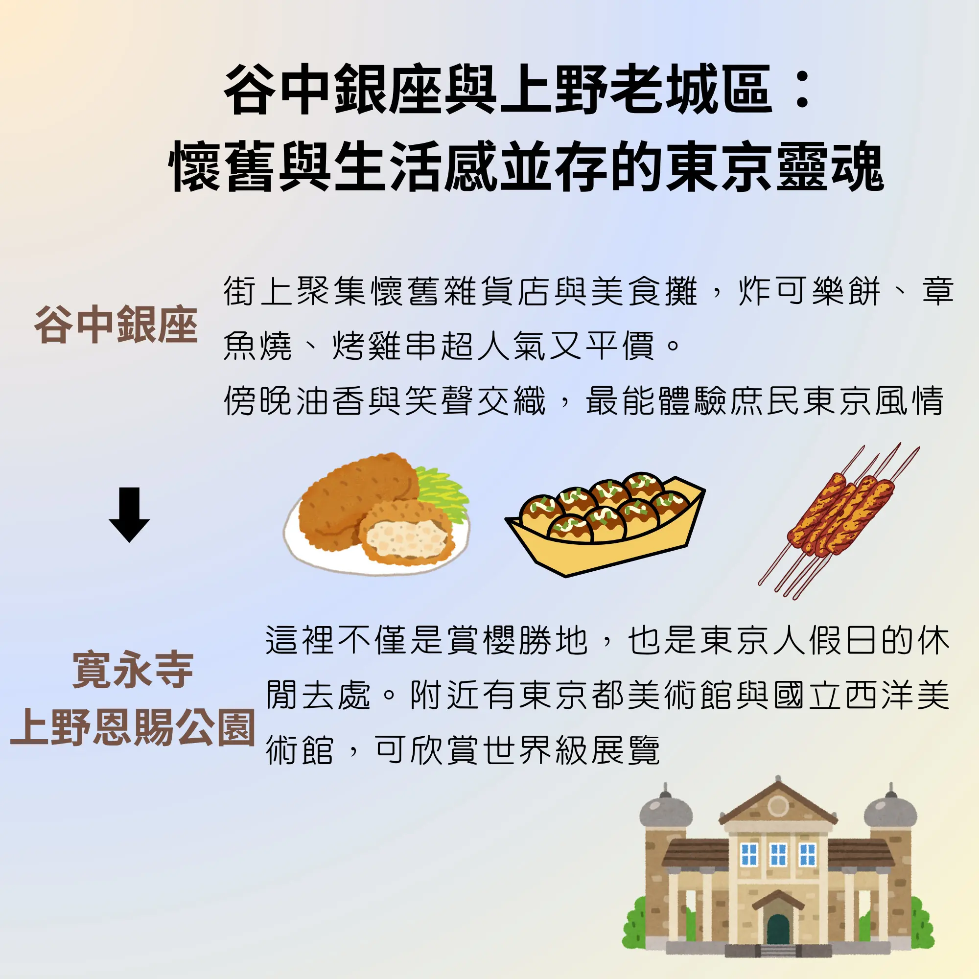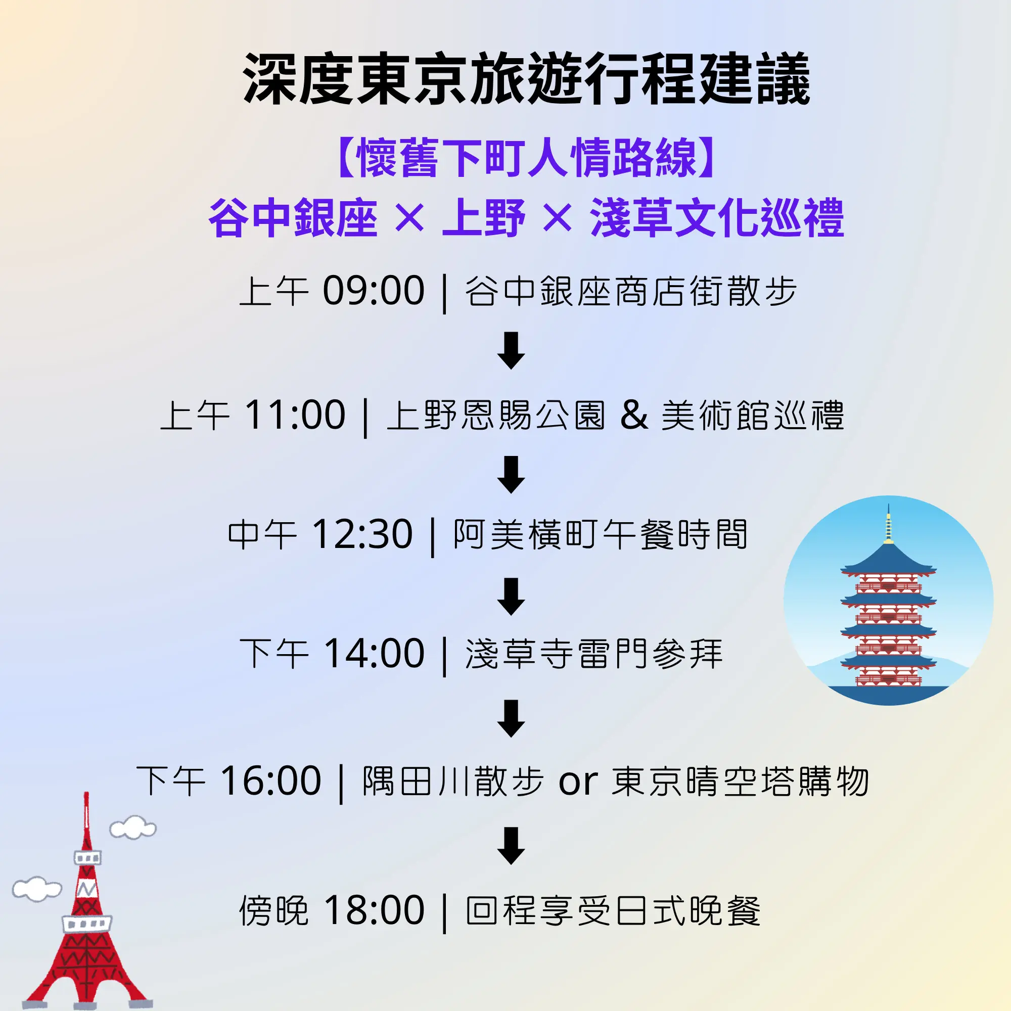 這條路線最適合喜歡懷舊氛圍與在地文化的旅人。你可以從東京的「舊城區」開始,走進保留昭和風味的谷中銀座,再順遊上野公園、淺草寺,感受真正的庶民東京。