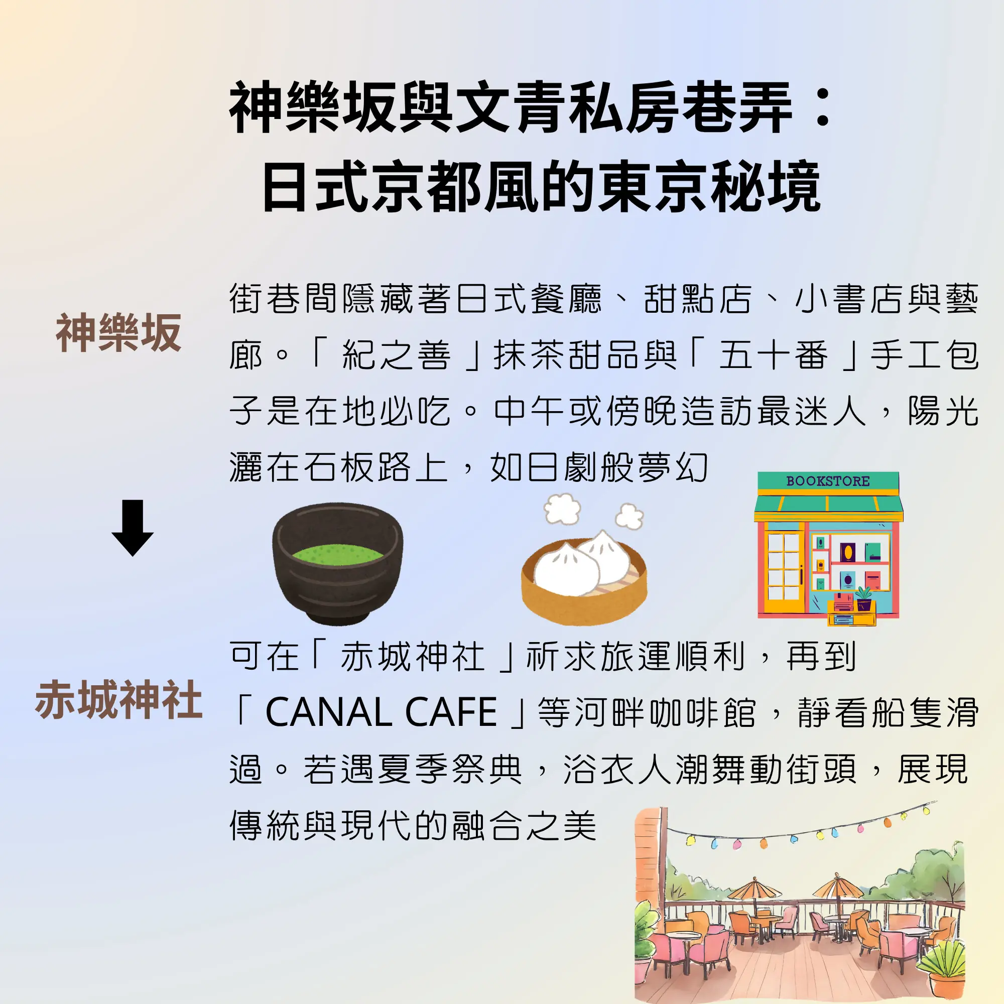 東京私房深度旅遊,我最大的感受是~~東京不只是繁華都市,更是一座充滿故事的城市。從谷中銀座的老街人情,到神樂坂的靜謐詩意,再到夜晚下北澤的音樂靈魂,每一處都讓人看見不同面向的【東京旅遊】風景。