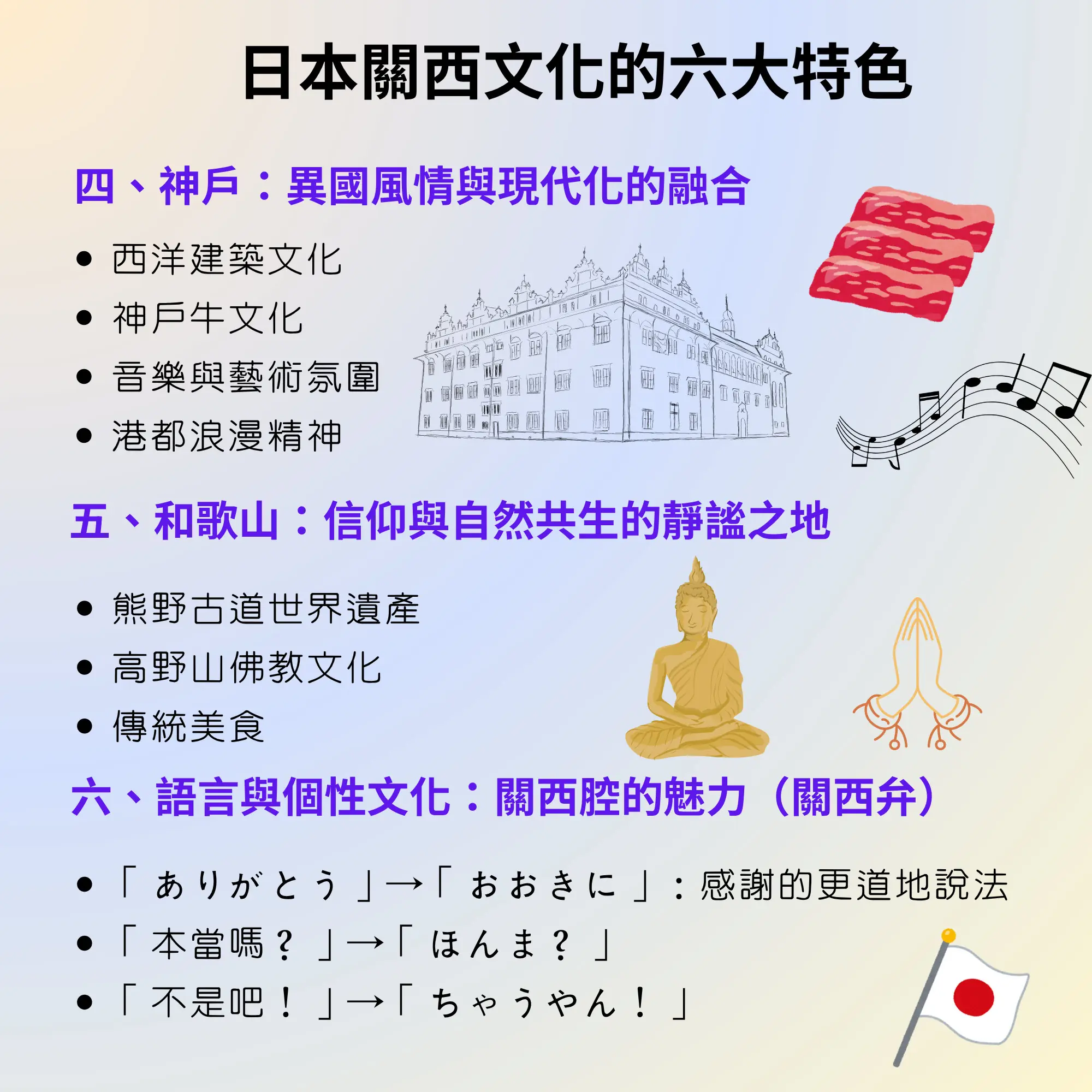 - 西洋建築文化:「北野異人館」區保存明治時期外國人住宅,融合德、英、法等多國風格。