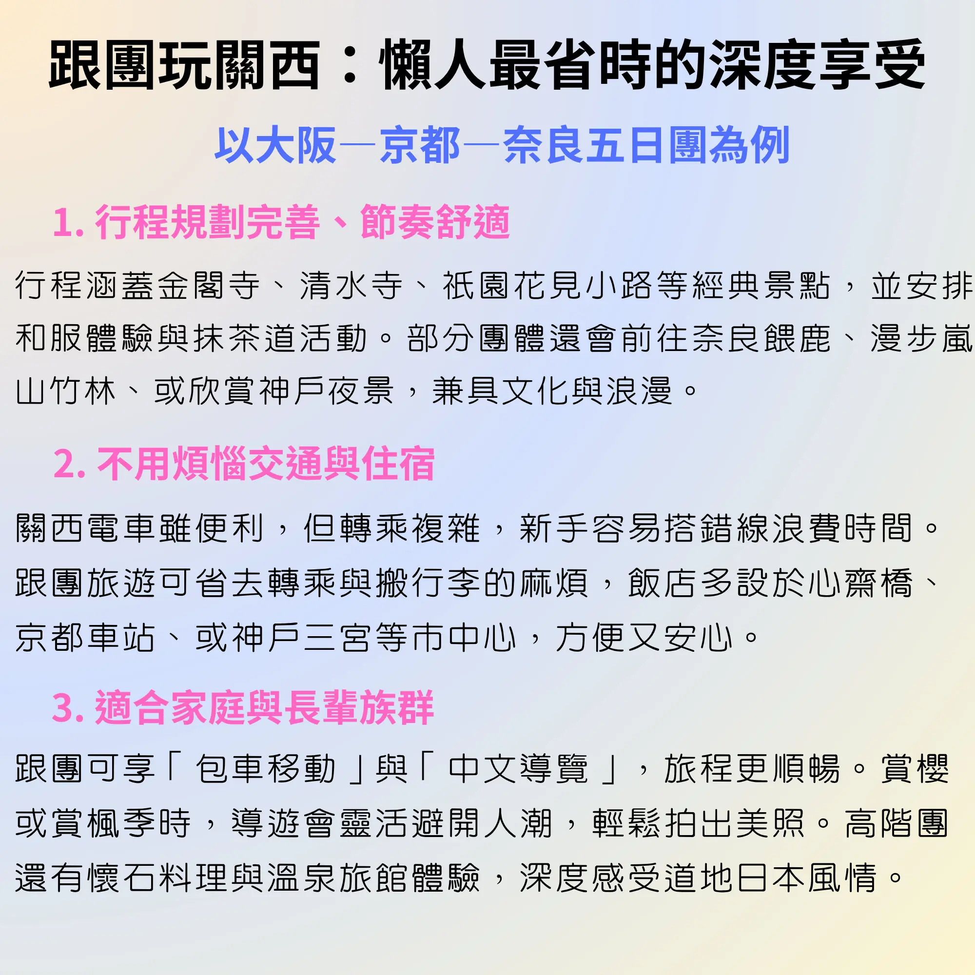 跟團與自由行,誰才是你的關西完美選擇?若你重視效率與安心,建議選擇「跟團」的【關西旅遊】,不僅行程安排周全,還能讓你用最少時間玩最多地方;若你偏愛自由與彈性,那麼「自由行」會更適合你,能深入挖掘在地小巷與文化生活。無論哪一種玩法,關西都值得一去再去~~這裡有熱情的人、美味的食物、與千年不變的日本精神。