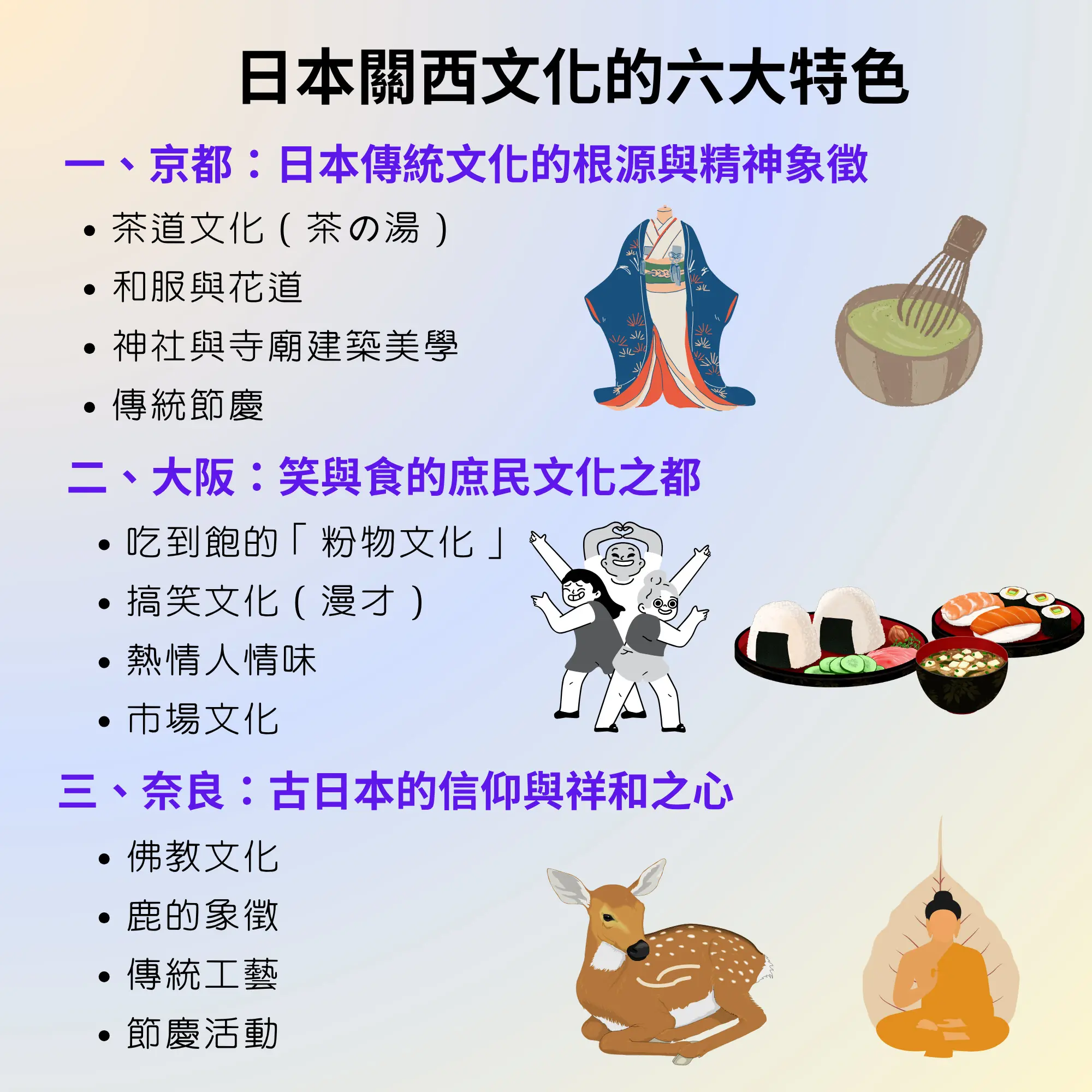 - 佛教文化:東大寺、藥師寺、唐招提寺等是日本佛教的根源,建築與雕像展現古日本信仰的莊嚴與藝術。
