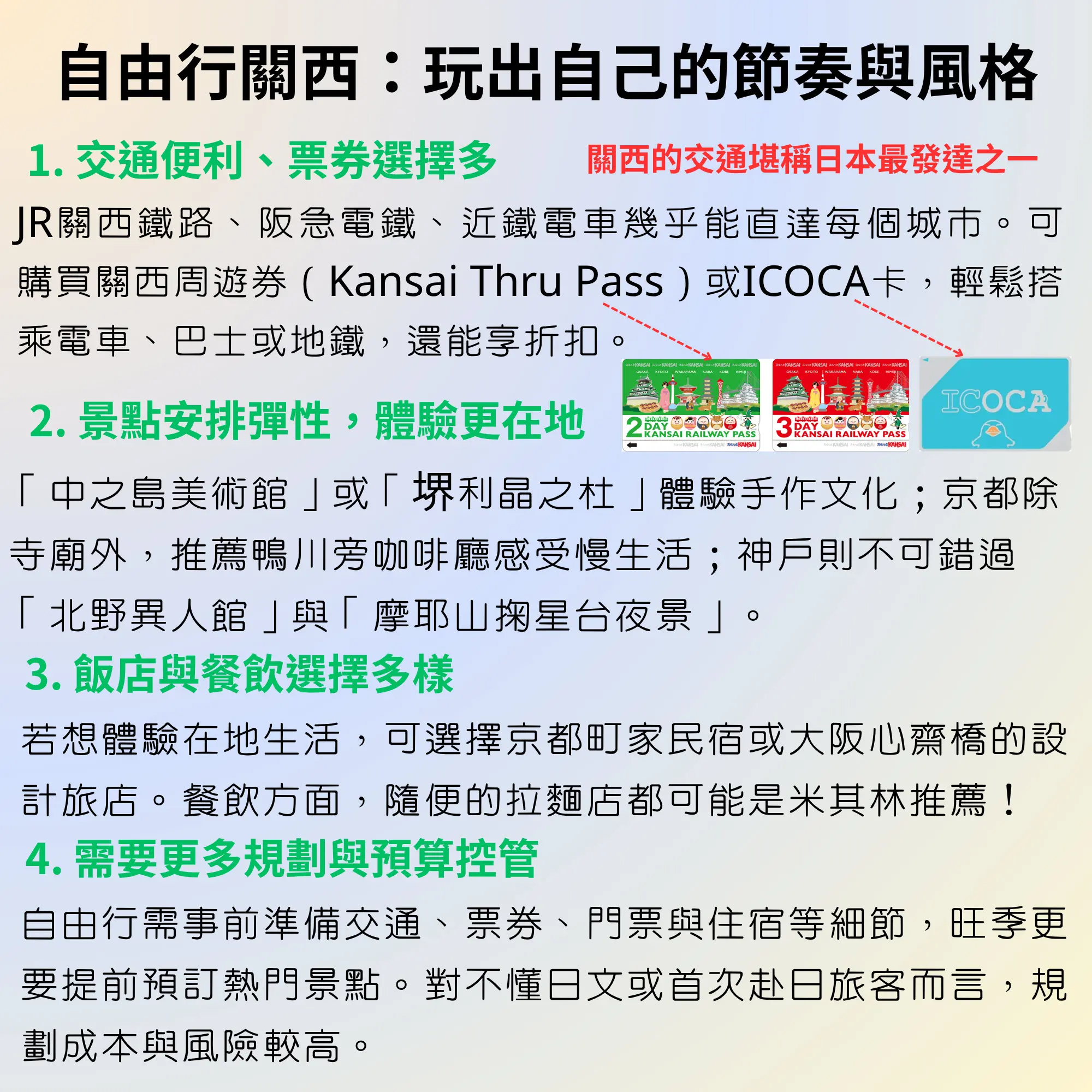 自由行需要事前做大量功課,包含交通、票券、門票、住宿預訂等。尤其在旺季,熱門景點常需提前訂位,否則容易錯過。對不懂日文或第一次到日本的旅客來說,規劃成本與風險相對高。不過只要事先安排妥當,自由行能讓你更深入體驗關西生活文化,拍出屬於自己的旅遊回憶。
