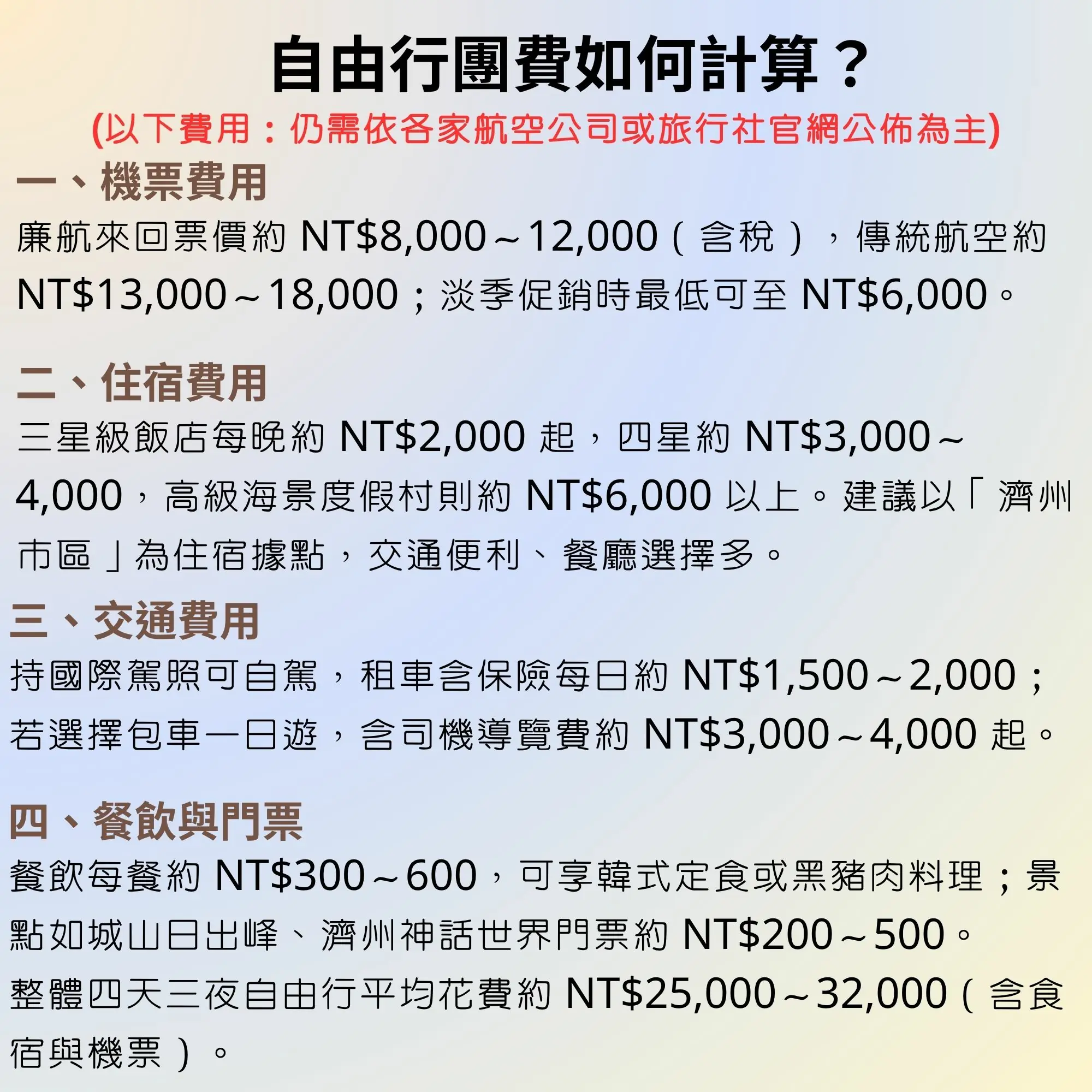 餐飲部分,每餐約NT$300~600元以上即可吃到韓式定食或黑豬肉料理。熱門景點如城山日出峰、濟州神話世界等門票約NT$200~500元以上。整體四天三夜自由行的平均花費約NT$25,000~32,000元以上(含食宿與機票)。