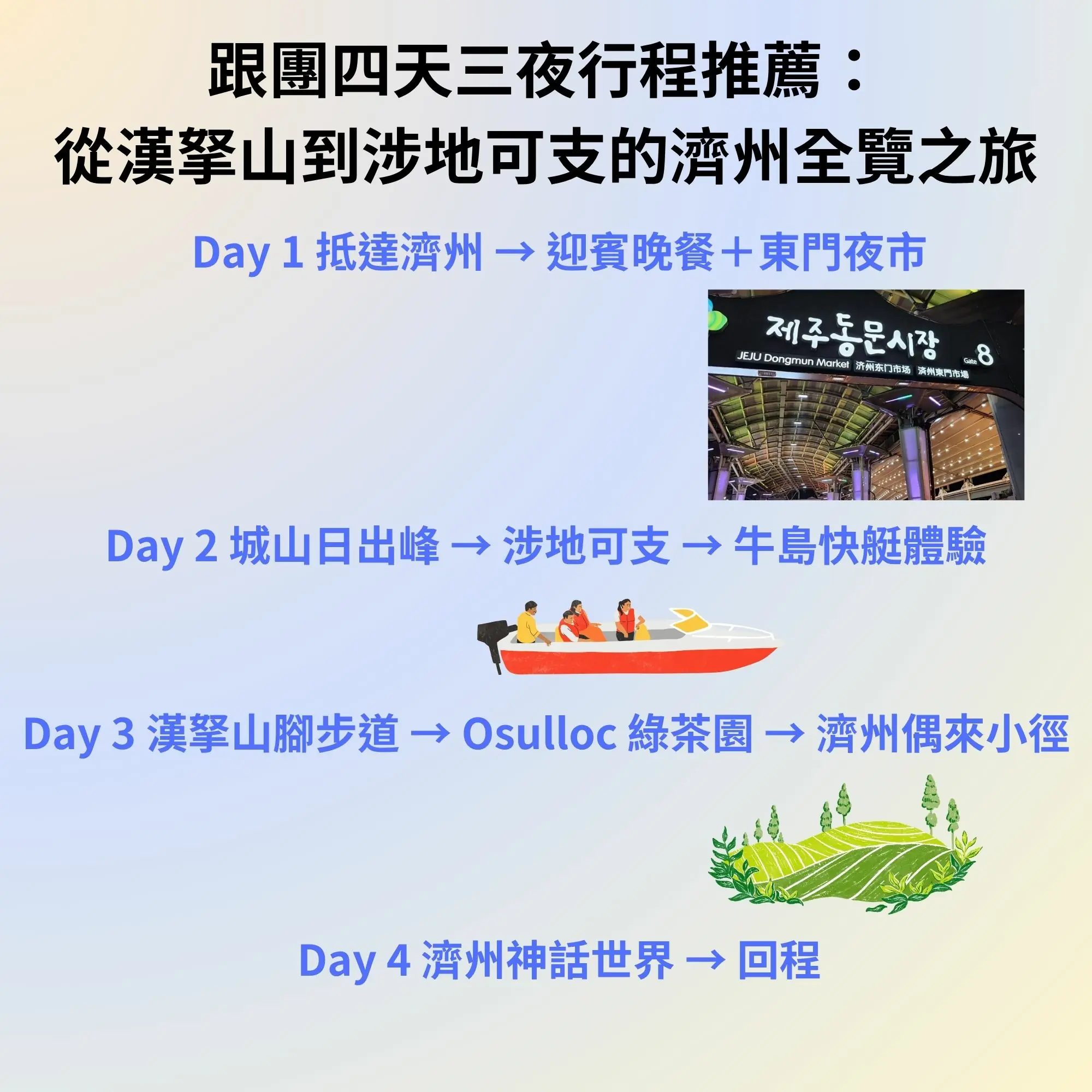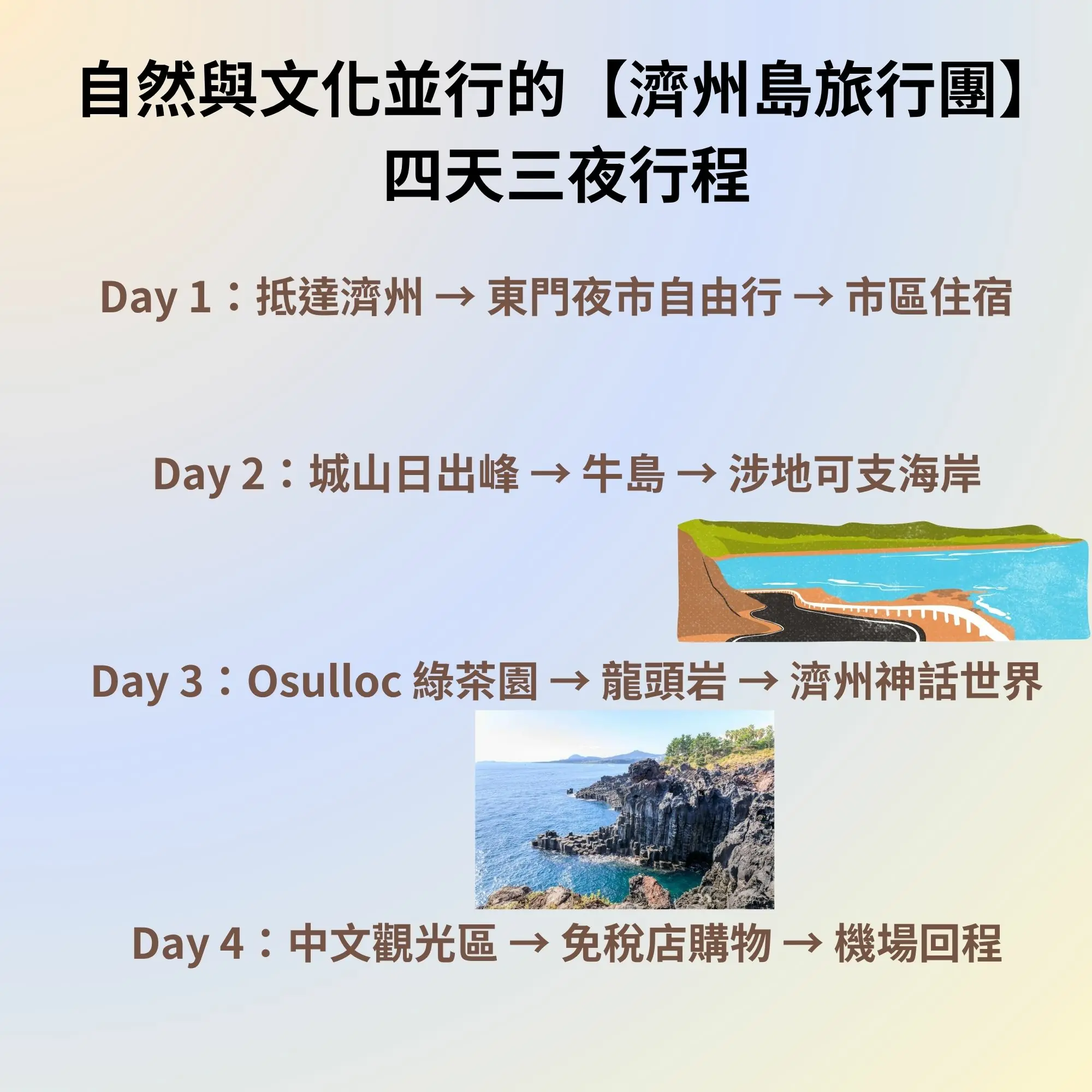 這套行程最適合第一次前往濟州島的旅人。內容結合了自然景觀、文化體驗與美食探索,讓人一次看盡濟州精華。