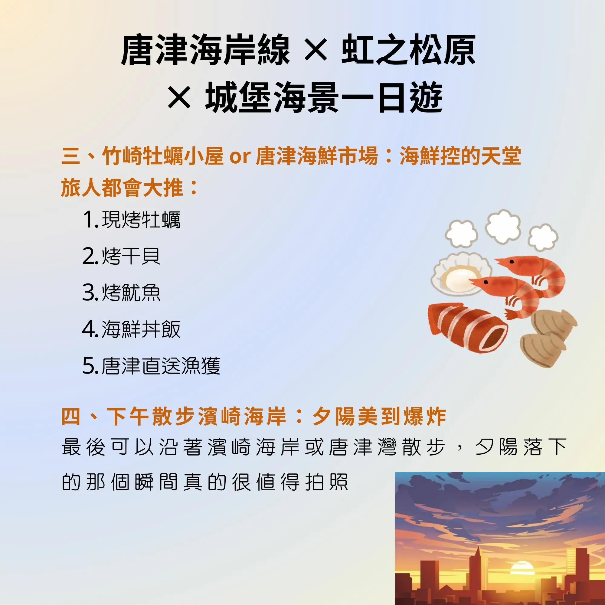 風景、海岸線、城堡 | 情侶、攝影、家庭 | 唐津城、虹之松原、海鮮市場 |